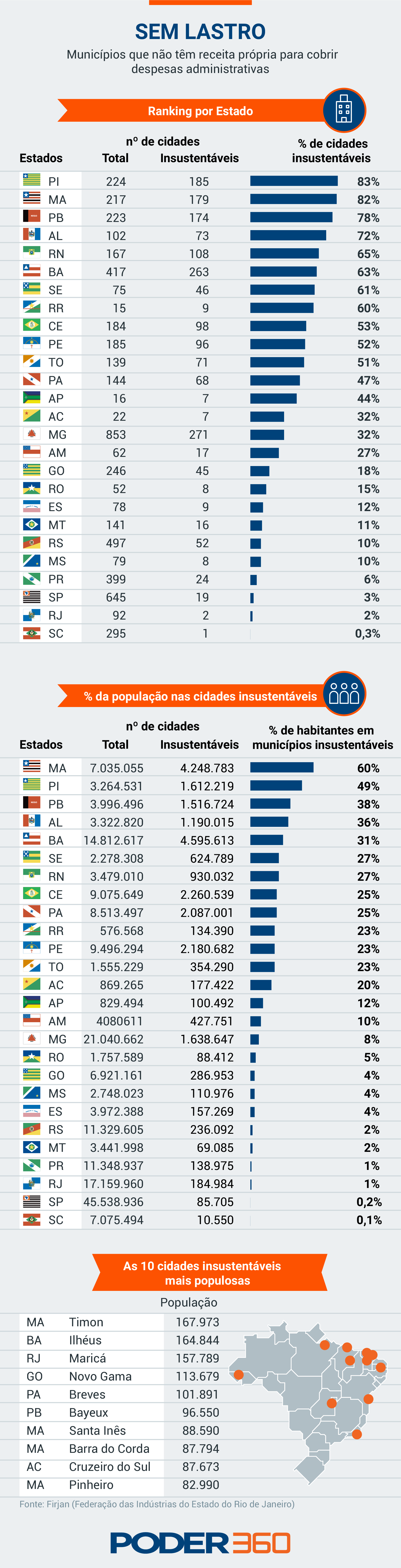 O Rio Grande do Norte aparece em quinto lugar no ranking, representando um percentual de 65% das cidades insustentáveis em sua totalidade, prejudicando pelos menos 930 mil habitantes. Ou seja, 27% da população potiguar.