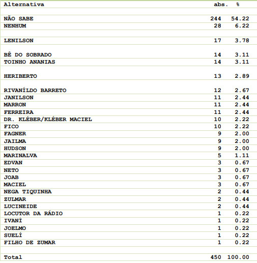 Com 2,44% apareceram: Janilson, Marron e Ferreira. Com 2,22%: Kleber Maciel e Fico. Com 2%: Fagner, Jailma e Hudson. Com 1,11%: Marinalva. Os demais citados não somaram 1%, cada. O total de indecisos foi de 54,22%. Outros 6,22% afirmaram não votar em qualquer dos pré-candidatos.