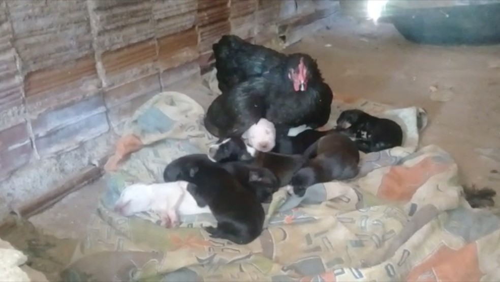 Uma galinha 'adotou' oito filhotes de cachorro que nasceram em um ninho do quintal de uma casa no município de Ielmo Marinho, na Grande Natal. A ave compartilha a proteção dos cães com uma cadela, que é a mãe biológica deles.