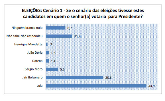 O ex-juiz da Lava Jato e ex-ministro da Justiça, Sérgio Moro, com poucos dias de pré-campanha já aparece em terceiro com 5,5% das intenções de voto. OS indecisos corresponderam a 11,8%. Brancos e nulos somaram 8,7%.
