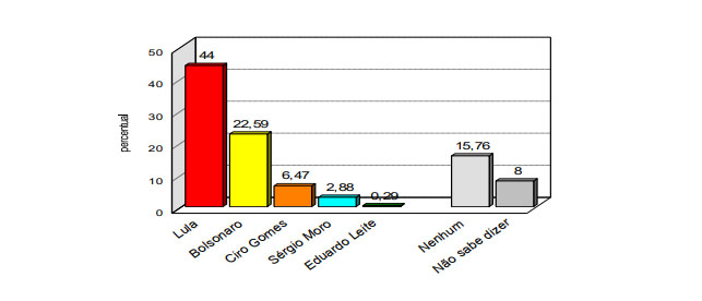 Dentro da pesquisa realizada com a população do Rio Grande do Norte para as eleições do próximo ano, o instituto Consult quis saber da população a intenção de votos para presidente. Além do cenário com todos os nomes, foi realizado um segundo cenário apenas com os principais nomes dos pré-candidatos e, nele, o ex-presidente Lula atingiu 44% das intenções de voto e o presidente Jair Bolsonaro, 22,59%.