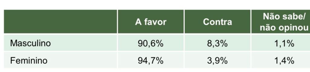 Destes números, o sexo masculino foi 90,6% a favor, 8,3% contra e 1,1% não sabe, ou não opinou. Já o feminino apresentou 94,7% a favor, 3,9% contra e 1,4% não sabe, ou não opinou.