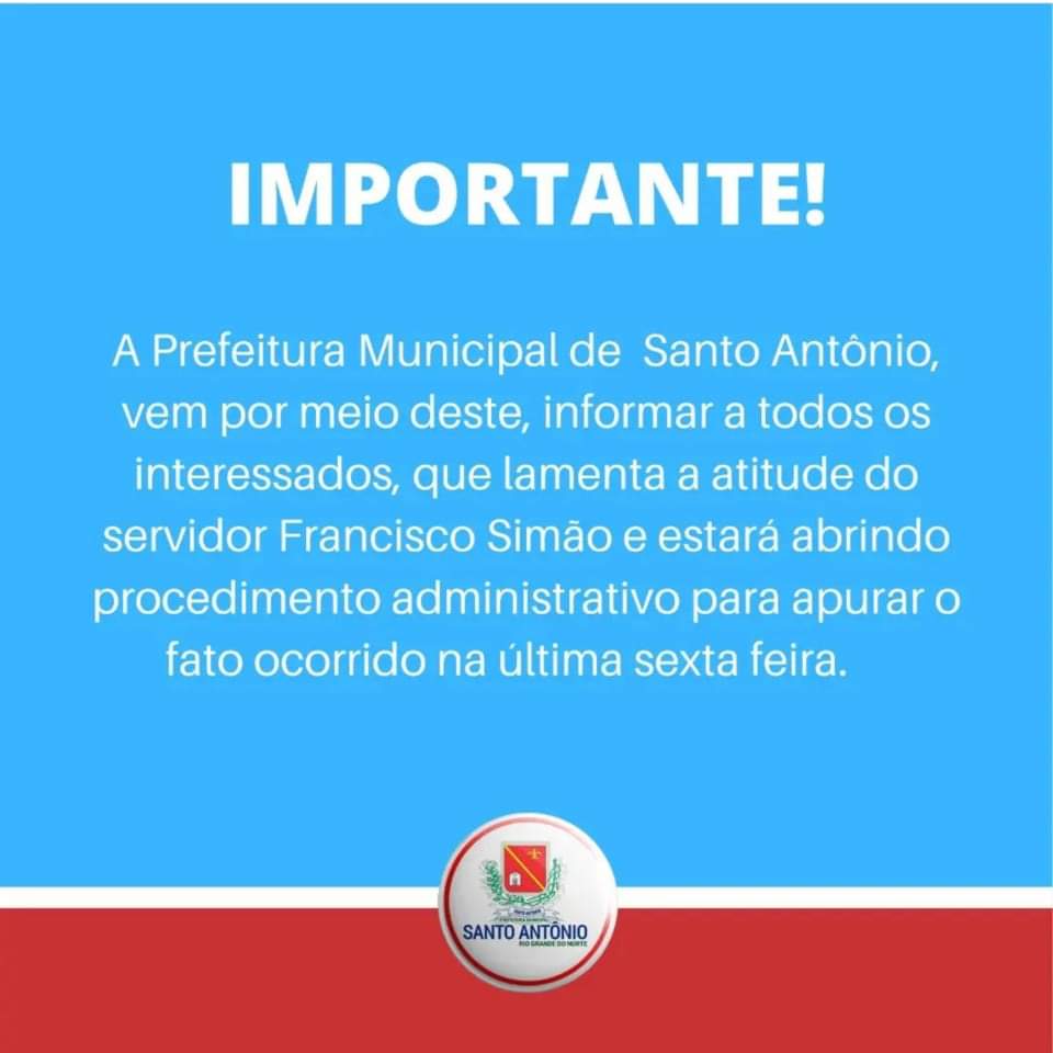 A respeito do episódio ocorrido na última sexta-feira (28) envolvendo o secretário de segurança do município, Tenente Simão, e um feirante, a Prefeitura Municipal de Santo Antônio emitiu uma nota afirmando que lamenta a atitude do titular da pasta.