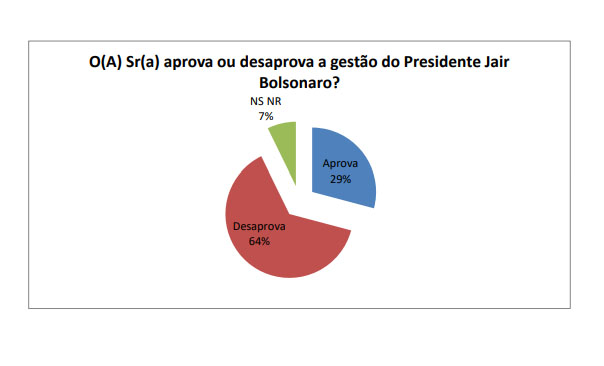 Um dos pontos avaliados foi a chamada avaliação administrativa, ou seja, saber da população se eles aprovam ou não as administrações estadual e federal. No âmbito do Governo Federal, a desaprovação da gestão do presidente Jair Bolsonaro foi de 64% e a aprovação foi de 29%. Outros 7% não souberam avaliar.