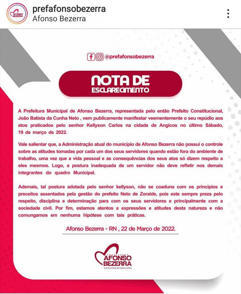 A nota tem como objetivo de informar de que, o Prefeito João Batista da Cunha Neto (Neto de Zoraide) é a gestão não compactua com o ato realizado pelo jovem, quando o mesmo praticou ato obsceno a uma figura cristã em festa realizada no último final de semana na cidade de Angicos/RN.