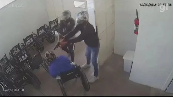 A ação ocorreu por volta das 11h30 em uma das entradas do hospital. As imagens mostram o paciente, identificado como Gilianderson dos Santos, na cadeira de rodas, vestindo uma touca escura e uma roupa azul. Ele estava prestes a receber alta da ala de Traumatologia do hospital.