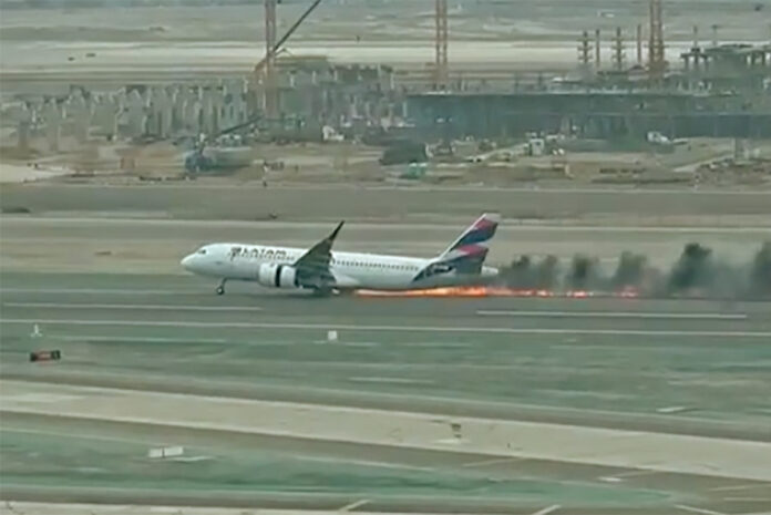 Um avião da Latam prestes a decolar no aeroporto internacional do Peru em Callao (cidade vizinha de Lima) bateu em um caminhão na pista nesta sexta-feira (18). O avião começou a soltar muita fumaça quase imediatamente.