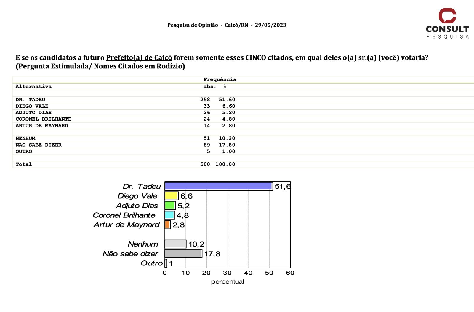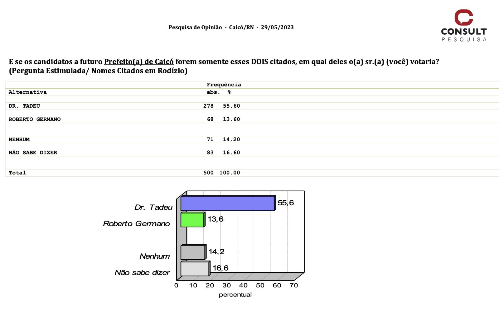 Um levantamento recente realizado pelo Instituto CONSULT revelou que se as eleições fossem hoje, o atual prefeito de Caicó, Dr. Tadeu, seria reeleito com ampla margem. A pesquisa, que contou com a participação de 500 entrevistados e abrangeu todas as 5 regiões e 20 bairros/localidades da cidade, indica que Dr. Tadeu possui 50% da preferência dos eleitores.