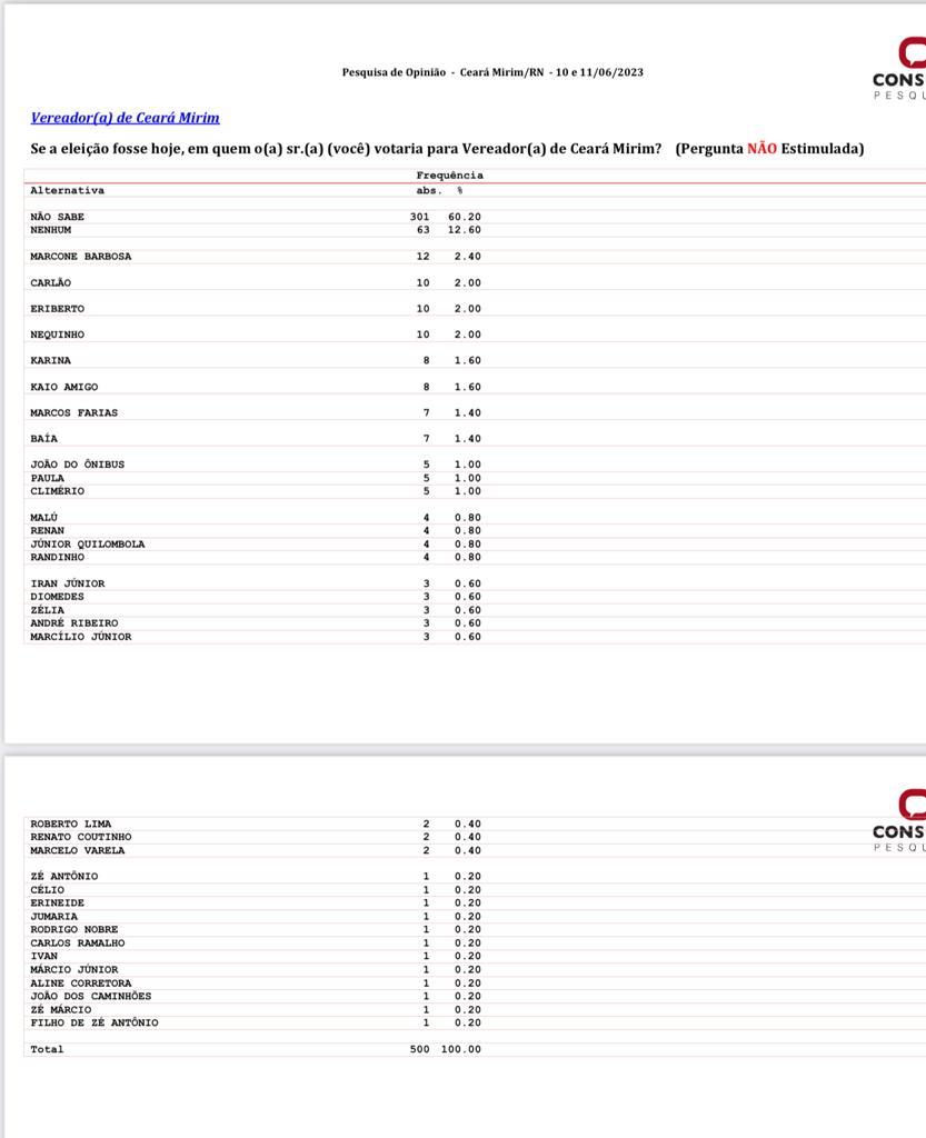 A disputa para uma das 15 vagas na Câmara de Ceará-Mirim também mostra um cenário semelhante à atual legislatura. Os citados são: Marcone Barbosa (2,4%); Carlão (2%); Heriberto (2%); Nequinho (2%); Carina Freitas (1,6%); Kaio Amigo (1,6%); Marcos Farias (1,4%); Baia de Jumaria (1,4 %); João dos Ônibus (1%); Paula de Zé das Chagas (1%); Climério (1%); Malu Coutinho (0,8%); Renan Cruz (0,8%); e Júnior Quilombola (0,8%); Randinho (0,8%); Iran Júnior (0,6%); Diomedes (0,6%); Zélia Santos (0,6%); André Ribeiro (0,6%). A pesquisa mostra que 60,2% não sabem em quem votar, enquanto que 12,6% não tem nenhuma indicação.