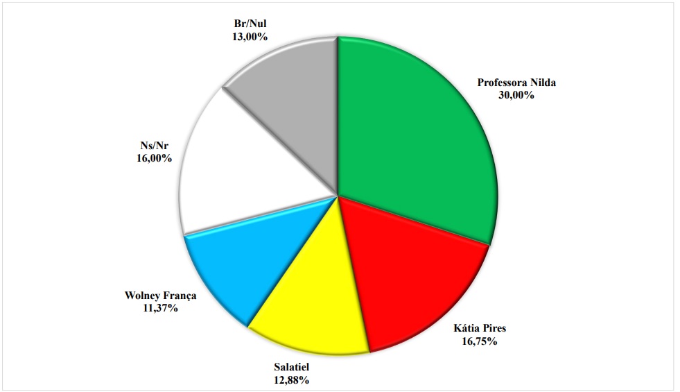 Professora Nilda foi lembrada por 30%, em seguida vem Kátia Pires com 16,7%, Salatiel com 12,8% e Wolney França com 11,3% O levantamento ouviu 800 pessoas, entre os dias 20 a 22 de julho de várias regiões do município, com margem de confiança de 95% e margem de erro de 3,5%.
