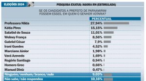 O presidente da Câmara Municipal de Parnamirim, Wolney França, cresceu mais de 70% nas intenções de voto na pesquisa para Prefeito de Parnamirim https://parnamirim.rn.gov.br/. O Instituto Exatus, em parceria com o jornal Agora RN, apontou o líder do legislativo da cidade já com 8,56%, na divulgação desta quinta-feira (13), empate técnico com o apresentador Salatiel de Souza (11,01%), tendo na liderança a professora Nilda (27,94%) e Katia Pires (15,15%), em segundo.