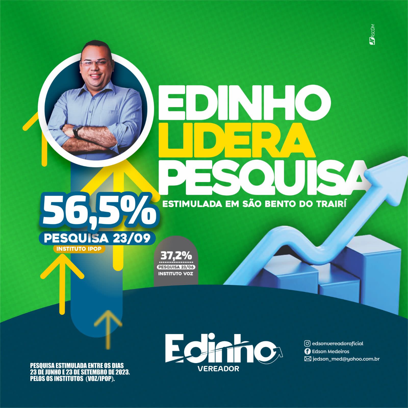 O vereador Edson Medeiros quem vem liderando as pesquisas é dono de um carisma particular, reconhecido por sua alegria e autenticidade apresentada através de sua postura. Vindo de origem humilde, filho de um agricultor e uma servidora pública. Edinho em seu primeiro mandato de vereador, tem mostrado pra que veio. Edinho dentre os nove vereadores é o que tem mais se destacado na Câmara em relação as ações desenvolvidas, tem apresentado importantes Projetos de Lei e convocado diversas audiências públicas, realizando ações sociais e cursos profissionalizantes em parceria com o Senar e o projeto Amigos em Ação.