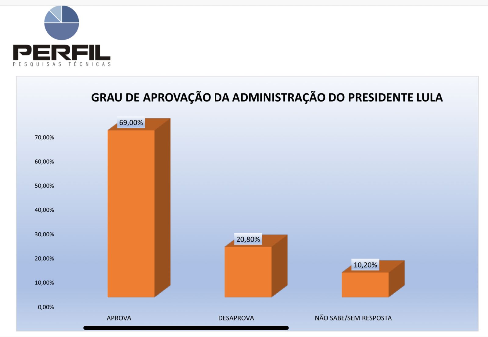 69% da população avalia o Governo Federal, do presidente Lula (PT) como aprovado. Desaprovam 20,80% e Não Sabe/Sem Resposta 10,20%.