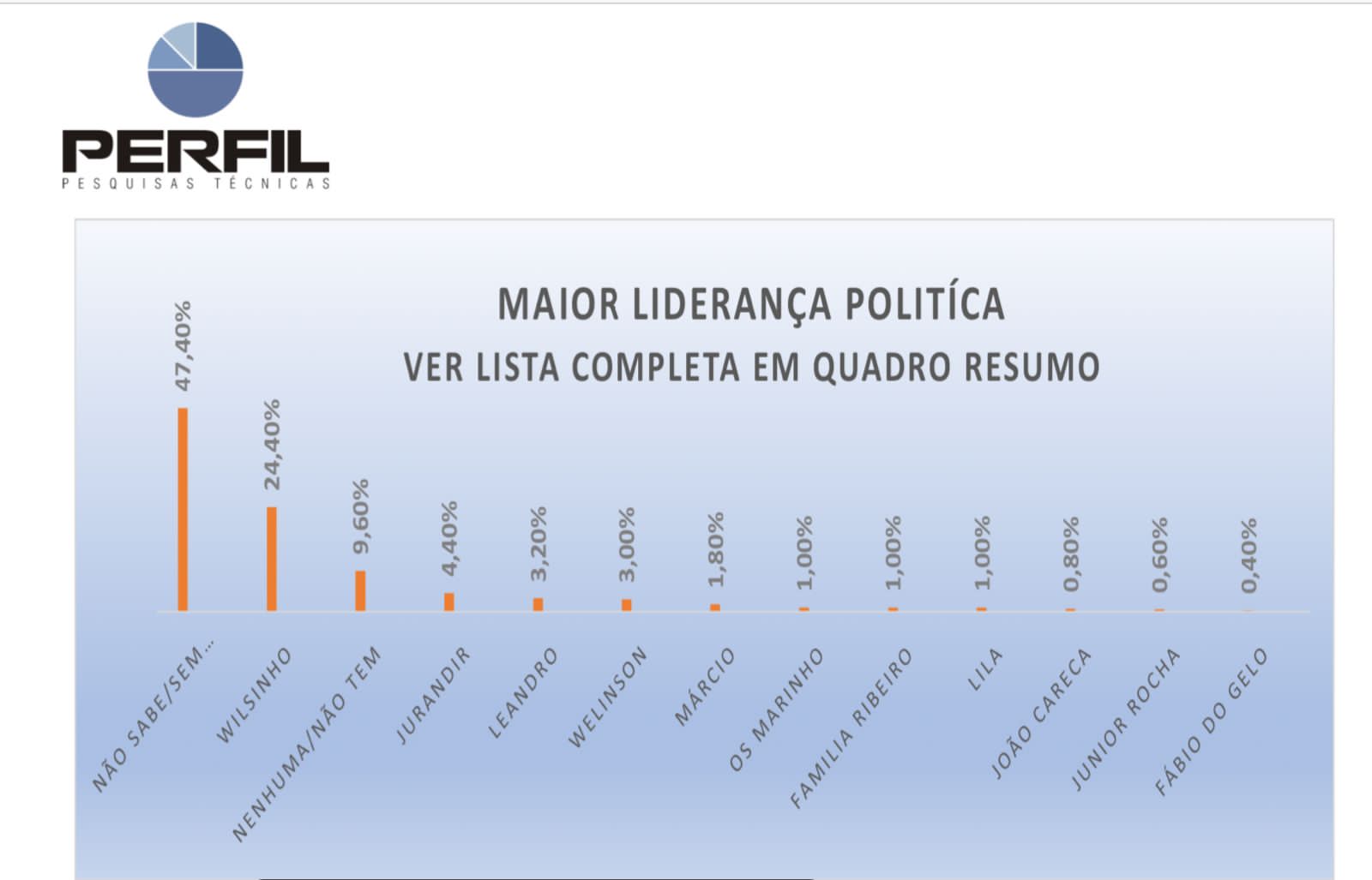 Na pergunta sobre a maior liderança no município, 24,40% confirmaram que é o prefeito Wilsinho Ribeiro. Em seguida, Não Sabe/Sem Reposta (47,40%), Nenhum/Não tem (9,60%), Jurandir (4,40%), Leandro (3,20%), Welinson (3%), Márcio (1,80%), Os Marinhos (1,0%), Família Ribeiro (1,0%), Lila (1,0%), João Careca (0,80%), Júnior Rocha (0,60%), Fábio do Gelo (0,40%), Câmara de Vereadores (0,20%), Anchele (0,20%), Caco (0,20%), Welington (0,20%), Hudson (0,20%), José (0,20%) e Joel do Bal (0,20%).