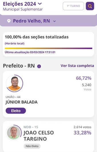 Após a totalização das urnas das eleições suplementares o eleito foi o candidato Júnior Balada (União Brasil) com 66,72%, contra 33,28% dos votos do adversário João Celso Targino (MDB).