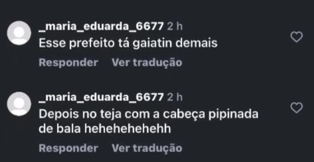 Em um dos comentários, um perfil com nome de usuário @_maria_eduarda_6677 diz “Depois no teja com a cabeça pipinada de bala”. No comentário anterior, o mesmo perfil faz referência ao Prefeito Eribaldo: “Esse prefeito tá gaiatin demais”.
