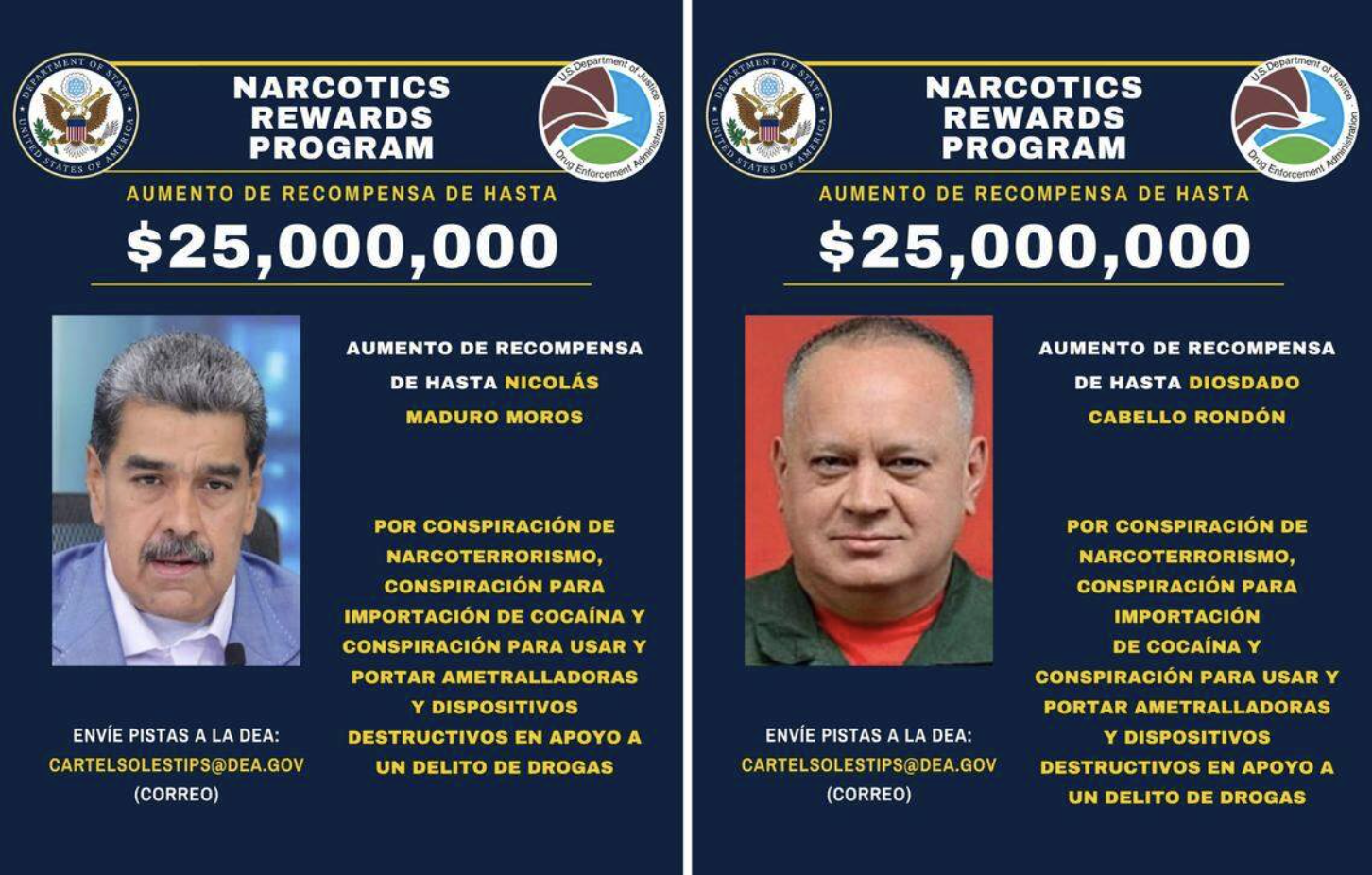 Em agosto, o governo norte-americano dobrou a recompensa pela captura de Nicolás Maduro para US$ 50 milhões, a maior já oferecida, e mantém prêmios de US$ 25 milhões para seus principais assessores, entre eles Diosdado Cabello (ministro do Interior) e Vladimir Padrino López (ministro da Defesa), ambos acusados de envolvimento no tráfico internacional de drogas.