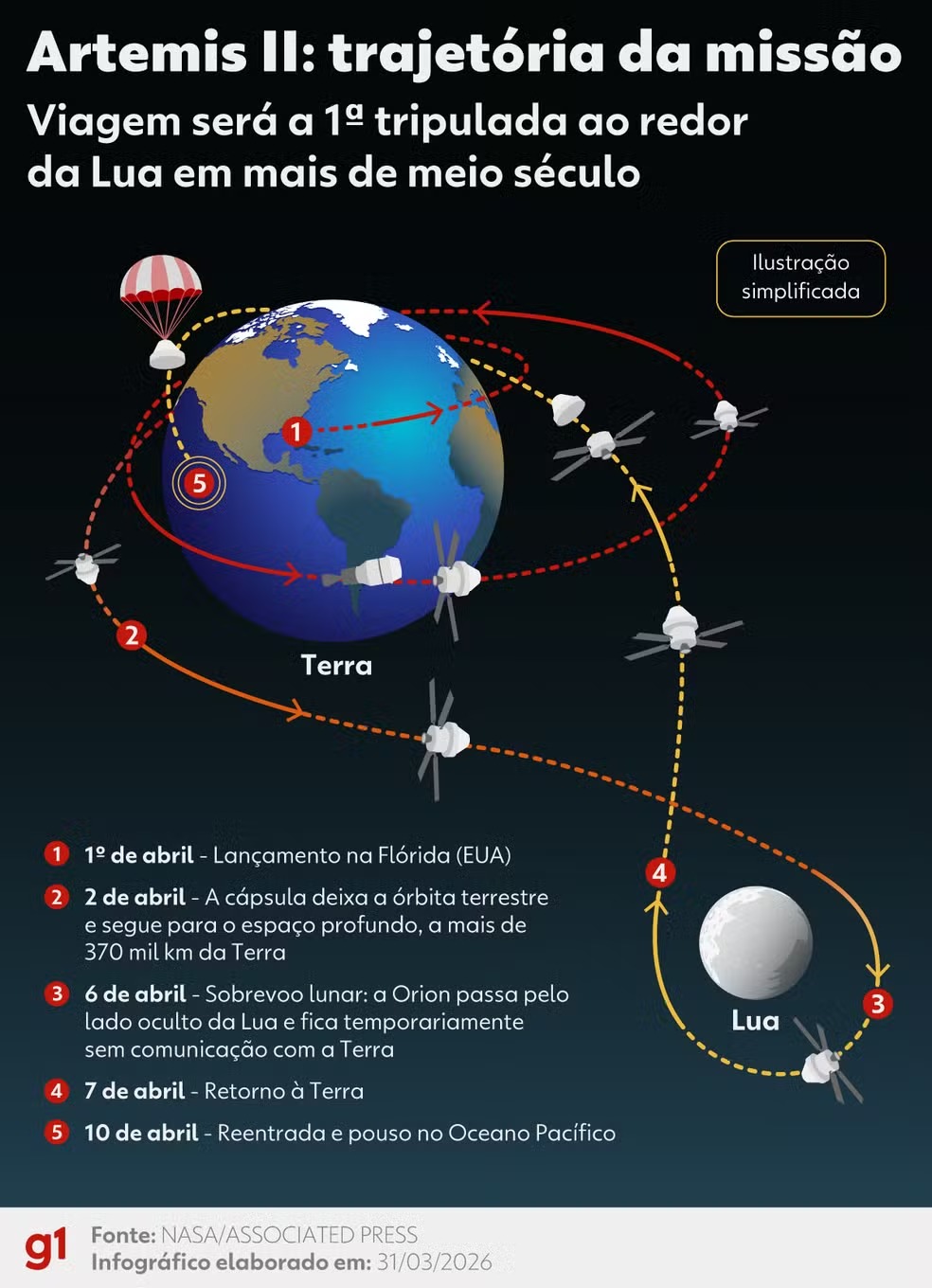 A missão Artemis II, lançada nesta quarta-feira (1º), já tem definido o momento mais aguardado: o sobrevoo da Lua está programado para domingo (6), quando a cápsula Orion passará entre 6.400 e 9.600 quilômetros da superfície lunar. Durante esse trecho, a nave ficará sem comunicação com a Terra por cerca de 30 a 50 minutos ao cruzar o lado oculto do satélite. “Para os 45 minutos em que estaremos mais perto da superfície lunar, também estaremos fora de contato”, disse o astronauta Victor Glover.